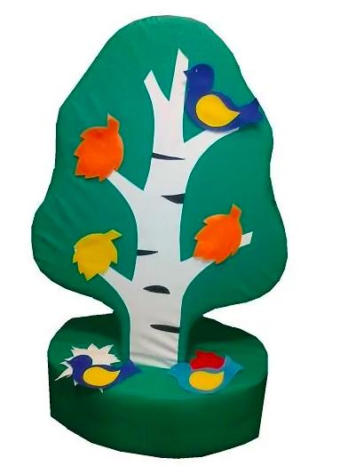 Дерево и подставка меняются под сезон. Габариты в собранном виде: высота 100 см, ширина 50 см. Материалы: искусственная поролон, поролон. Комплектация: дерево, подставка, дидактические элементы.