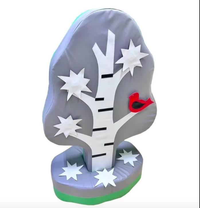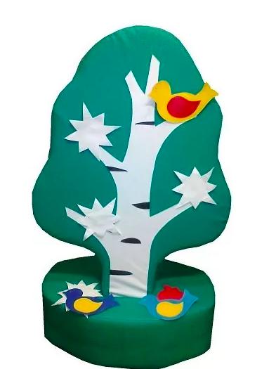 «Дидактическое дерево» состоит из мягкого модуля в виде дерева и мягкой подставки к нему. Дерево оснащено двумя комплектами аппликаций (листочки, яблочки, груши, птички, бабочки или снежинки), которые крепятся к дереву при помощи липучки.
